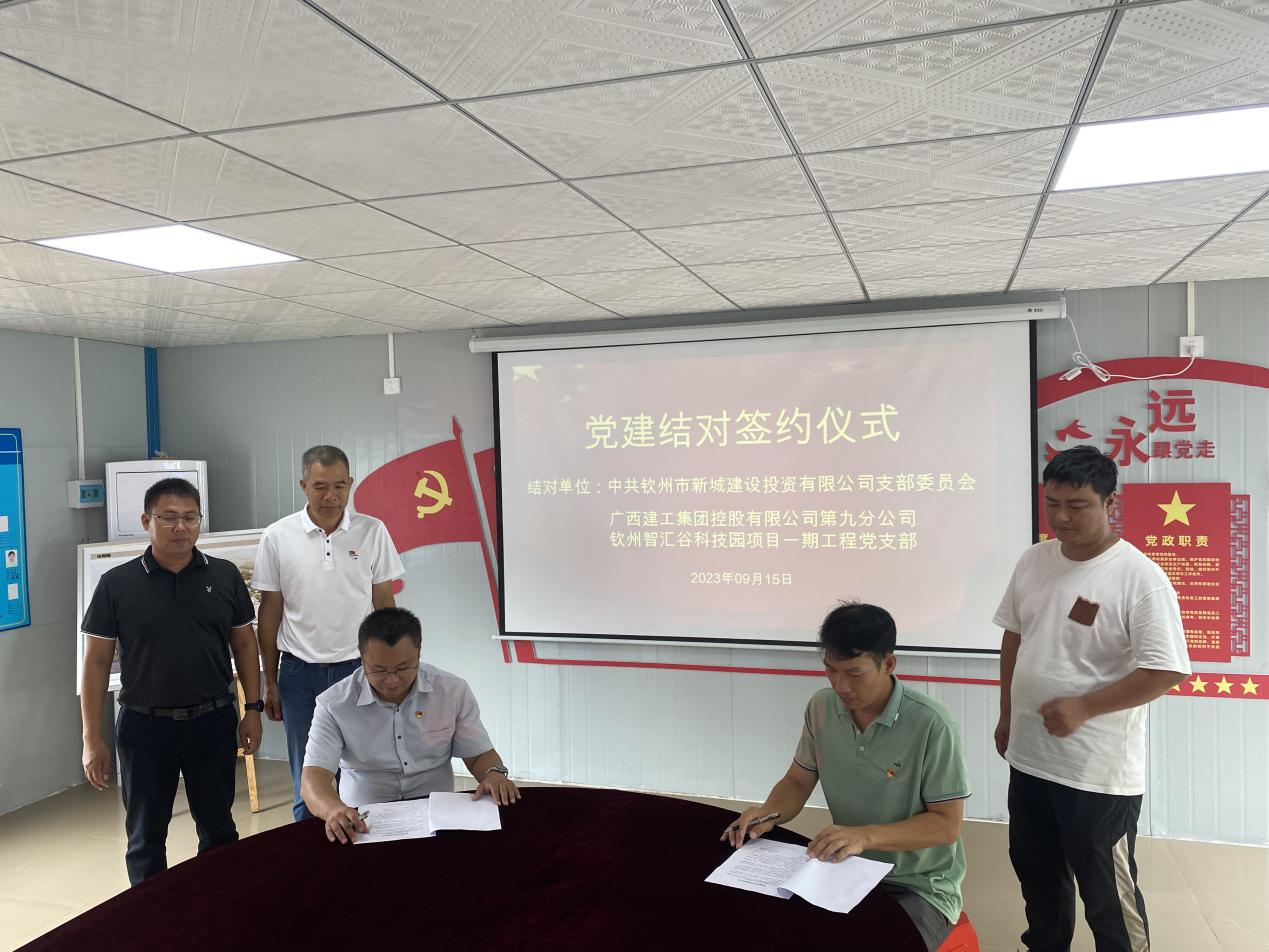 為充分發(fā)揮黨建引領(lǐng)作用,護(hù)航項(xiàng)目建設(shè)質(zhì)量、安全生產(chǎn),促進(jìn)市重點(diǎn)項(xiàng)目建設(shè)提速增效,2023年9月15日,建投公司黨支部與廣西建工集團(tuán)欽州智匯谷科技園項(xiàng)目一期工程黨支部舉行黨建結(jié)對(duì)共建協(xié)議簽約儀式。集團(tuán)公司副總經(jīng)理、建投公司黨支部書記劉雙,欽州智匯谷科技園項(xiàng)目一期工程項(xiàng)目經(jīng)理劉鐘明等出席簽約儀式并簽約。