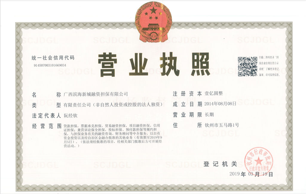 根據(jù)原廣西壯族自治區(qū)金融工作辦公室《廣西壯族自治區(qū)金融工作辦公室關(guān)于印發(fā)2018年全區(qū)融資擔(dān)保公司現(xiàn)場(chǎng)檢查工作方案的通知》(桂金辦融函〔2018〕106號(hào))的整改要求,我擔(dān)保公司立即展開公司名稱的變更工作。經(jīng)欽州市行政審批局同意,于2019年3月19日完成公司名稱的變更并取得新營(yíng)業(yè)執(zhí)照,變更后的名稱為“廣西濱海新城融資擔(dān)保有限公司&...