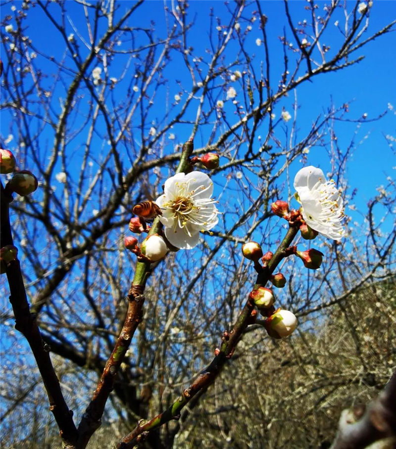八寨溝梅園四周青山環(huán)繞,鳥語花香,當梅花盛開時,漫山遍野的梅花與青山綠水交相輝映,宛如世外桃源;當你置身其中,極目望去,朵朵梅花在艷陽冷風中傲然綻放;遠望,一樹繁花似錦如雪,近賞,朵朵白梅挺立枝頭,小巧的花瓣,精致的花蕊,潔白無瑕,成群的蜜蜂在花間縈繞。