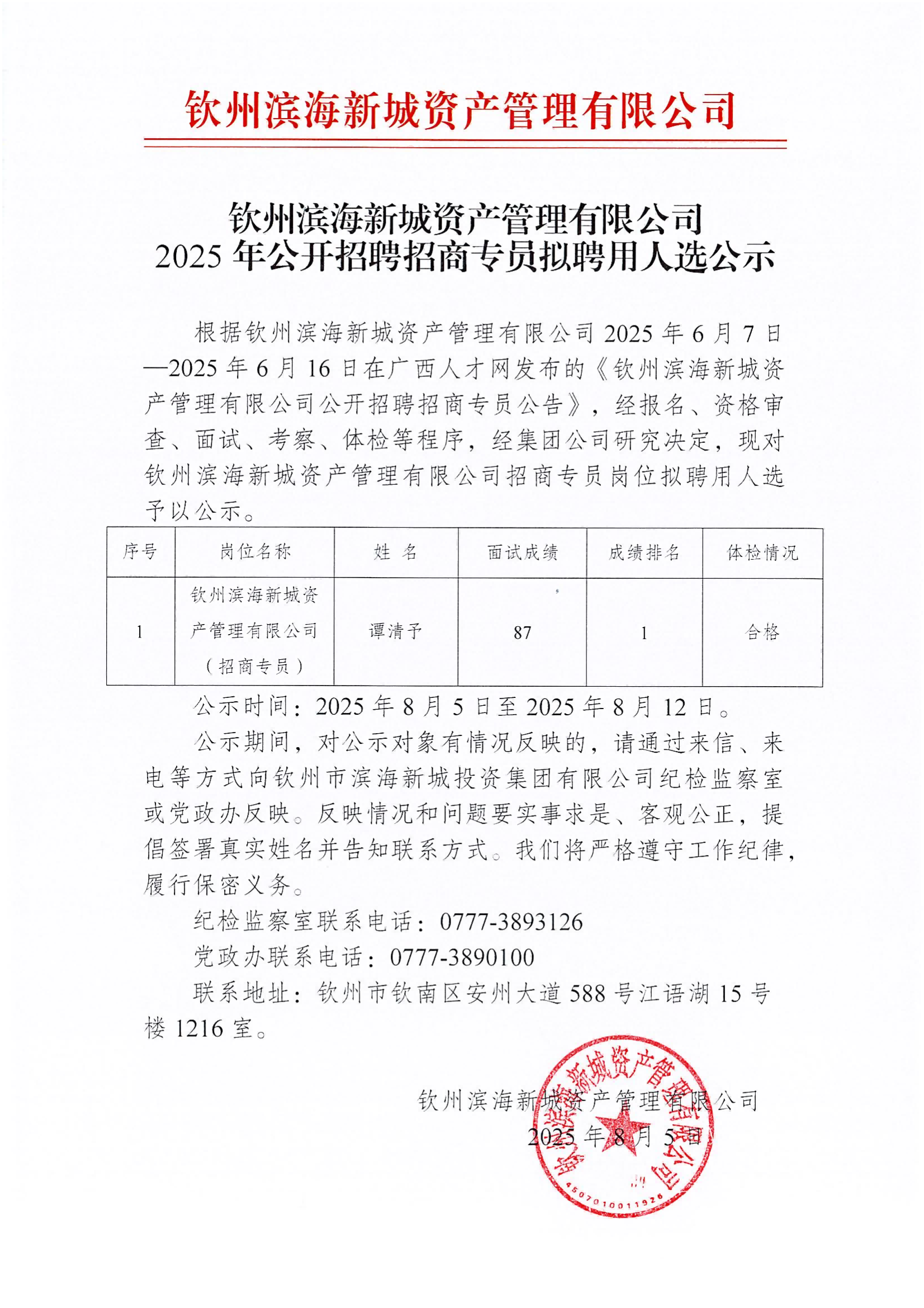 欽州濱海新城資產(chǎn)管理有限公司2025年公開招聘招商專員擬聘用人選公示