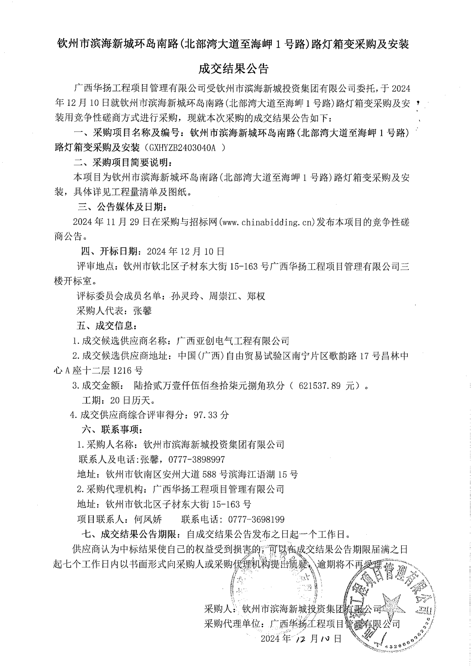 成交公告-欽州市濱海新城嘉興街污水泵站、K1+760處路燈箱變及10KV配電安裝工程