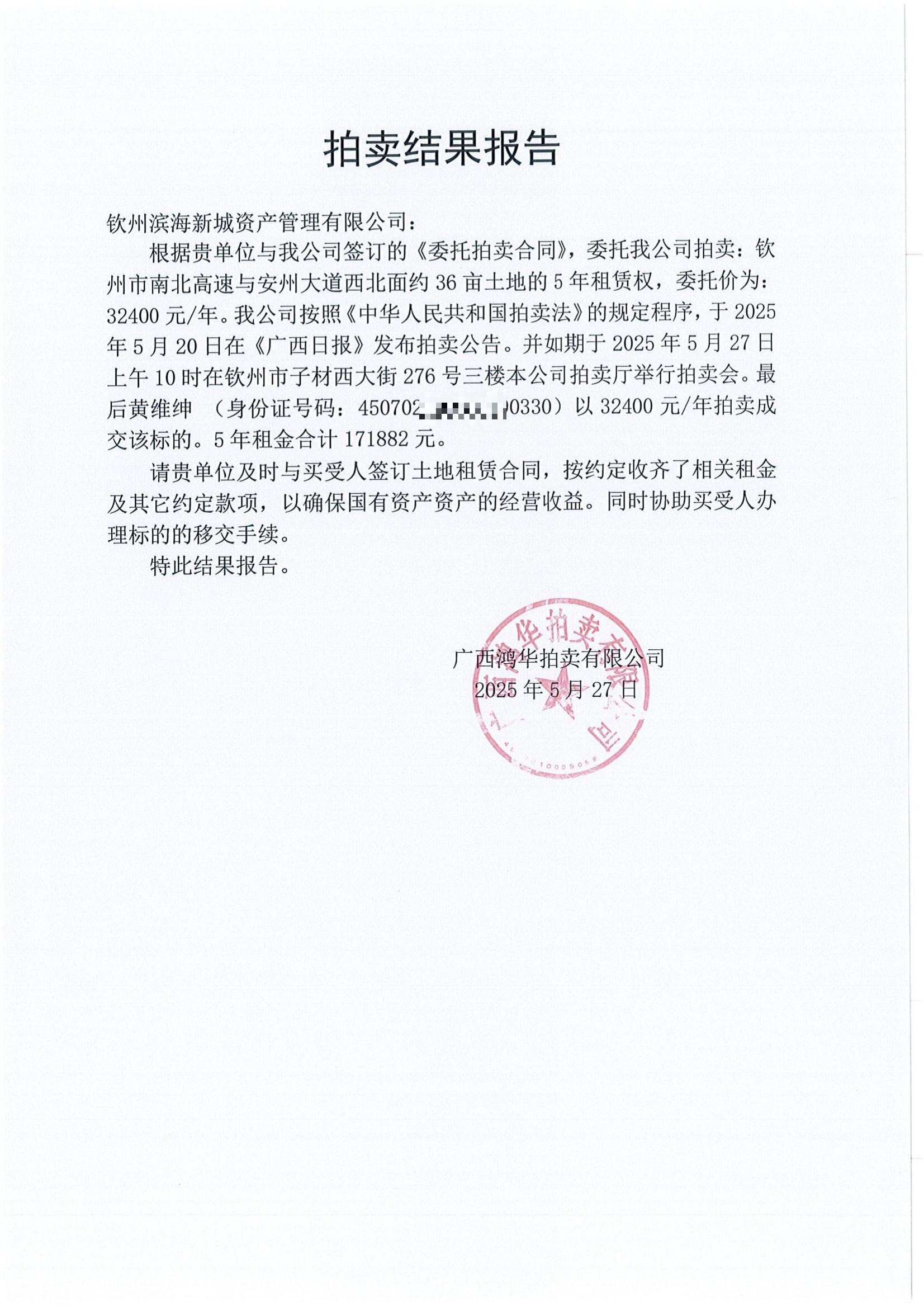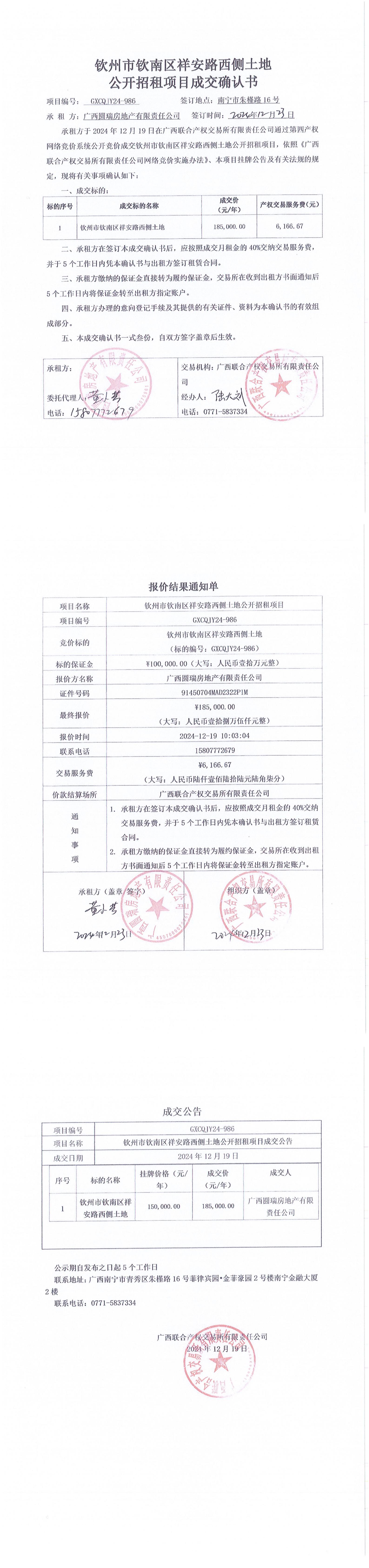 欽州市欽南區(qū)祥安路西側(cè)土地公開招租項(xiàng)目成交確認(rèn)書