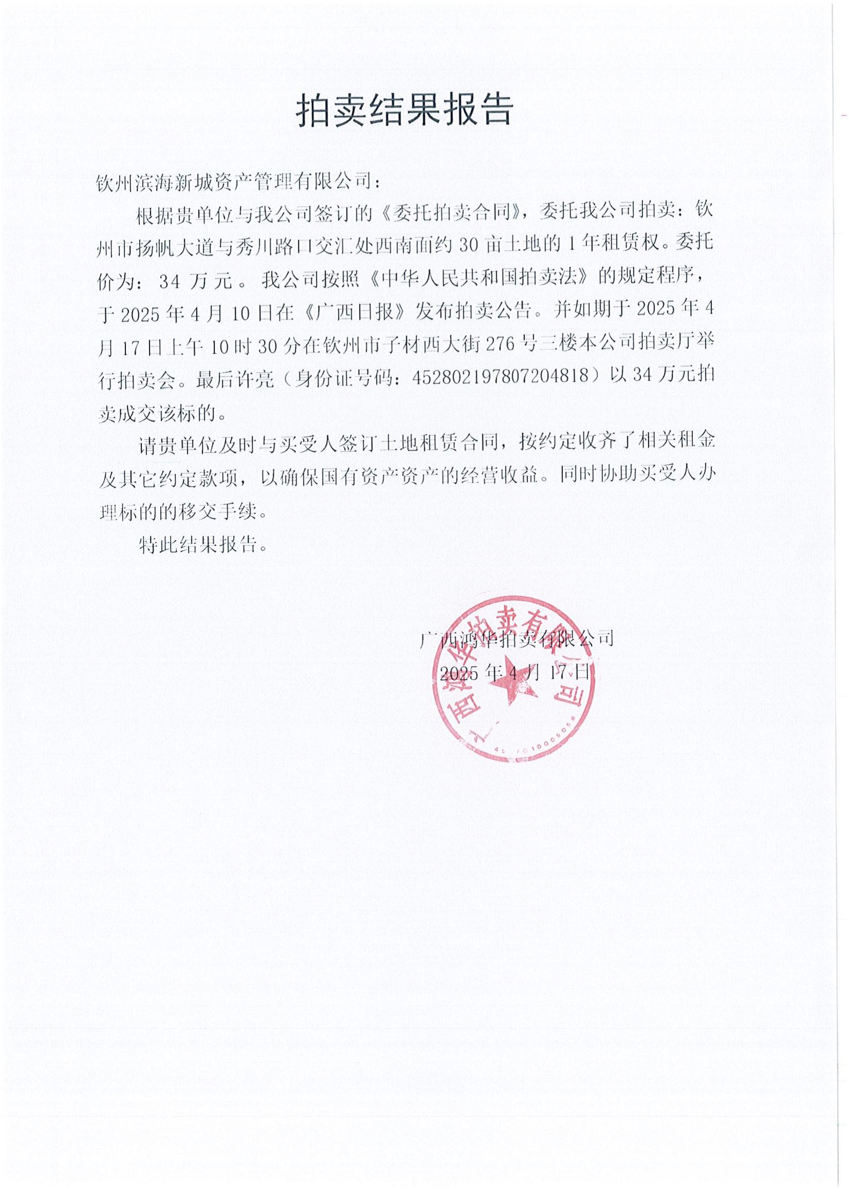 拍賣結(jié)果報告